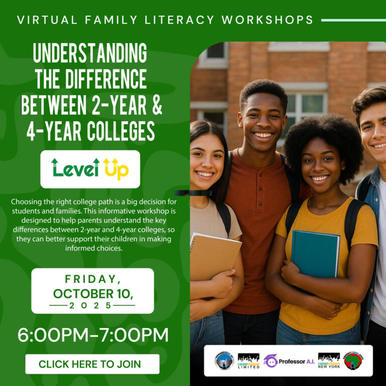 Choosing the right college path is a big decision for students and families. This informative workshop is designed to help parents understand the key differences between 2-year and 4-year colleges, so they can better support their children in making informed choices.