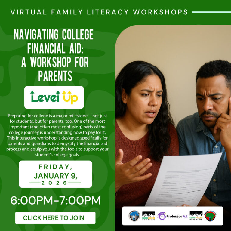 Navigating the world of financial aid can be overwhelming, but it doesn’t have to be! Join us for an informative workshop designed to help you understand the various financial aid options available for your child’s education. Whether your child is preparing for college or vocational school, this session will guide you through the essential steps to securing financial assistance.